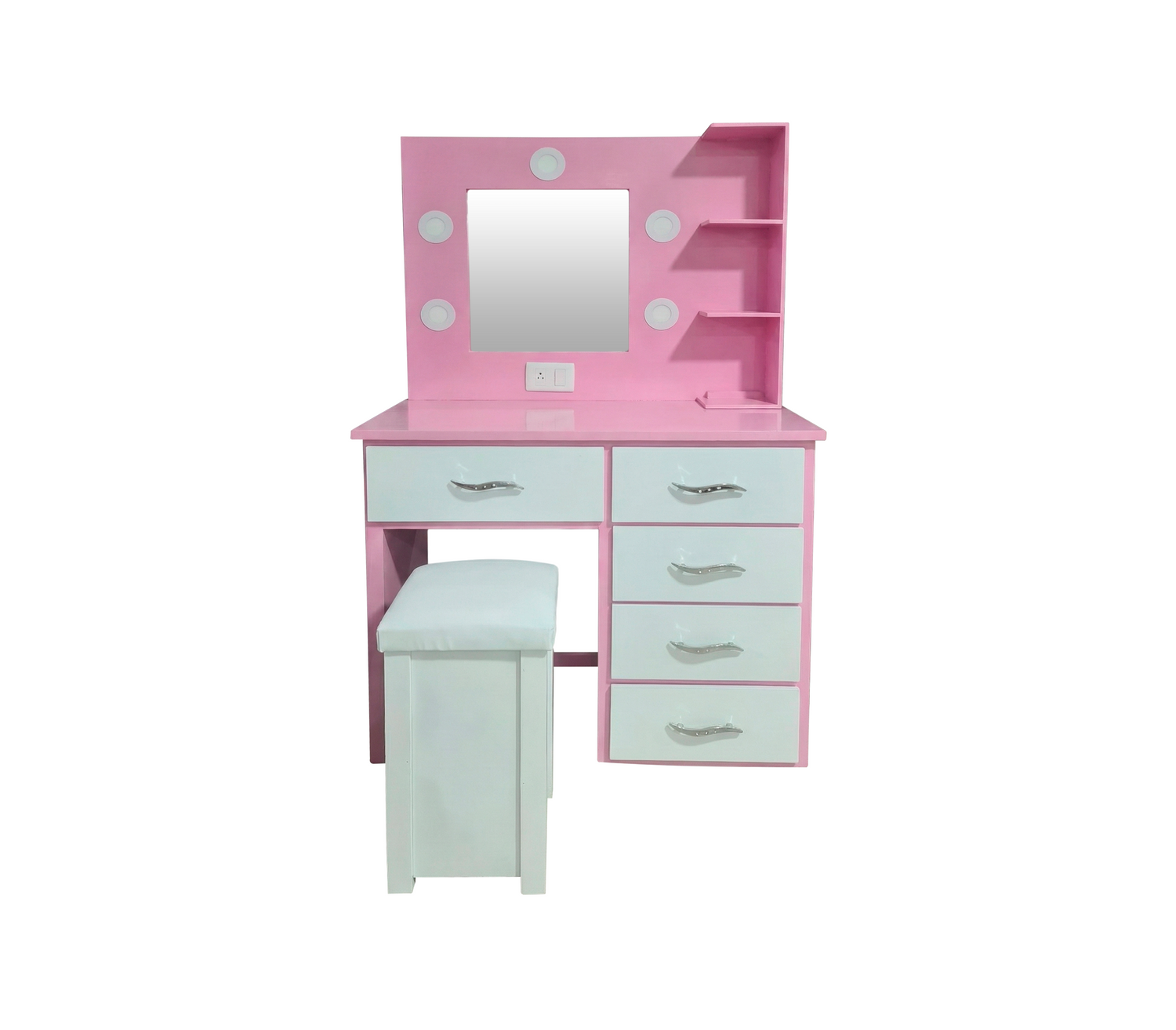 Gracias a su configuración derecha, se adapta perfectamente a la disposición de tu habitación, permitiéndote aprovechar cada rincón con estilo. Cuenta con un total de 5 gavetas blancas que te brindan el espacio ideal para resguardar tus cosméticos y accesorios de forma ordenada. Además, este conjunto viene equipado con espejo de gran amplitud para que no pierdas ningún detalle, y se complementa con una cómoda banqueta rosada que aporta un color vibrante y femenino a tu decoración.