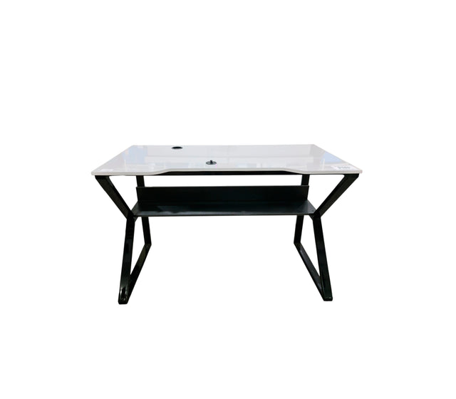 Esta es una mesa de escritorio moderna y funcional, diseñada para el uso de computadora, que combina la robustez del metal con la estética limpia y brillante de la melamina.